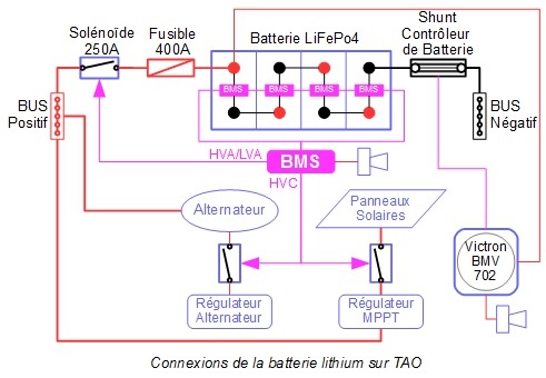 Vous noterez, chose très importante, que seulement deux fils sont connectés à la batterie au lithium (plus éventuellement la sonde de tension du contrôleur de batterie). Toutes les connexions se font sur les différents Bus.