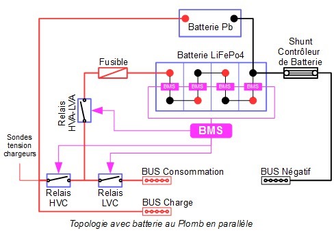 Lorsque le relais HVC s’ouvre pour déconnecter la batterie au lithium du Bus de charge, les systèmes de charge ont toujours une batterie à charger et ne sont pas perturbés. Il est important d’avoir les sondes de tension des systèmes de charge connectés après le relais afin que la régulation de charge se fasse correctement lorsque le relais est ouvert.