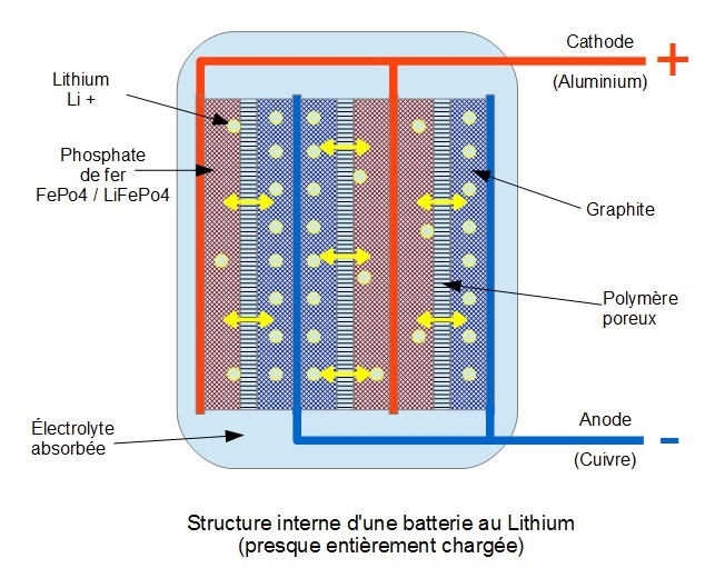 Lorsque la batterie se charge, les ions Lithium migrent dans l’électrolyte pour venir s’insérer dans la structure carbone de l’électrode négative alors que l’électrode positive (LiFePo4) s’appauvrit en lithium pour ne laisser que la structure cristalline FePo4. Inversement, durant la décharge, les ions lithium quittent la structure carbone de l’électrode négative, migrent dans l’électrolyte et reviennent s’insérer dans la structure cristalline de l’électrode positive pour reformer LiFePo4.