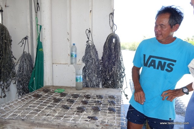 Par chance Éric est là, et il prend plaisir à expliquer les différentes étapes de la culture des nacres. Son business est croissant, la perle se porte bien!![]()