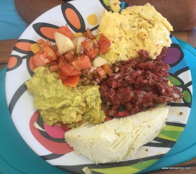 Alors pour fêter la réparation du guindeau, nous préparons une assiette bien copieuse, avocat, tomates, fruit de l’ arbre à pin, œufs et le nec plus ultra du cornedbeef!!! C’est ce que nous avait préparé Tehina aux Marquises à Tahuata et honnêtement c’est bon mais un peu