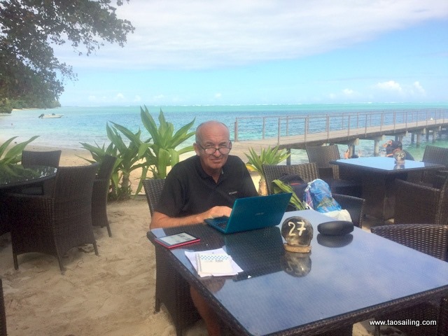 Nous partons vers le sud de l’ile en longeons le récif et mouillons dans la baie d’Havea non loin du Resort pour avoir une connexion internet,
