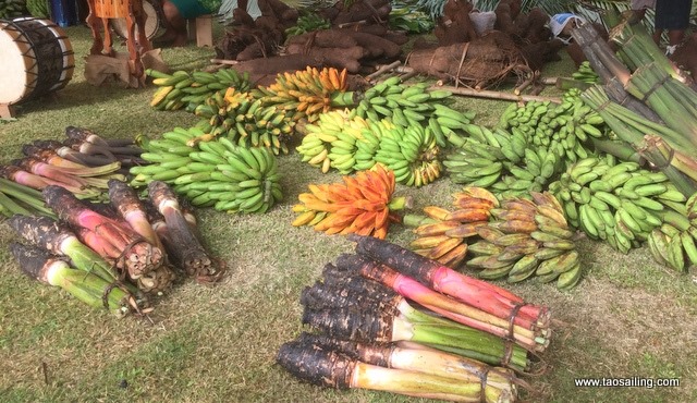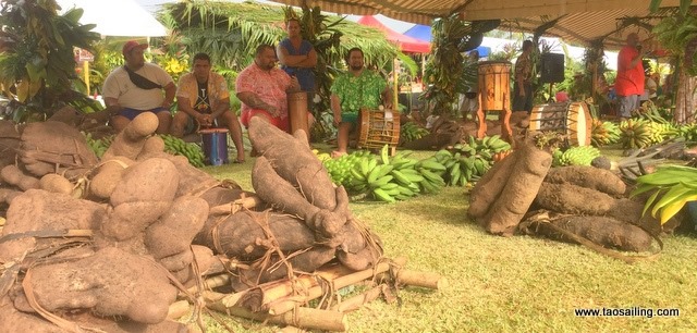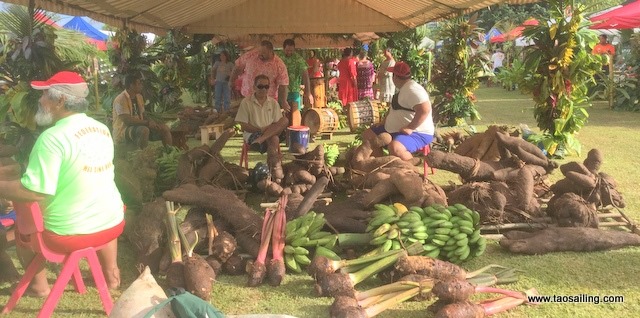 Le festival a Huahine débute avec la foire agricole où les agriculteurs exposent les différentes variétés de racines, bananes et autres légumes ou fruits.![]()