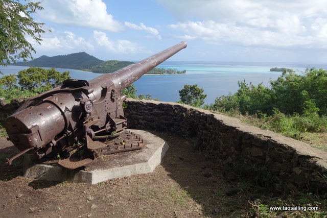 Dernier mouillage à la pointe de Outu Ohu au nord de la passe où l’accès à terre est facile pour monter jusqu’aux canons,