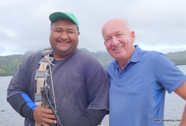 La baie de Rapa ainsi que toute la zone Est de l’île sont protégées par un “Rahui”. Il est donc interdit d’y pêcher autrement qu’à la ligne. Mais demain le comité local a décidé d’ouvrir le Rahui pour une pêche sous marine communautaire de 7 heure du matin jusque 14 heure. De bon matin Philippe embarque sur une baleinière avec nos amis Remu et François… et une quinzaine de plongeurs. En tout une dizaine de bateaux emmènent les plongeurs. ![]()
