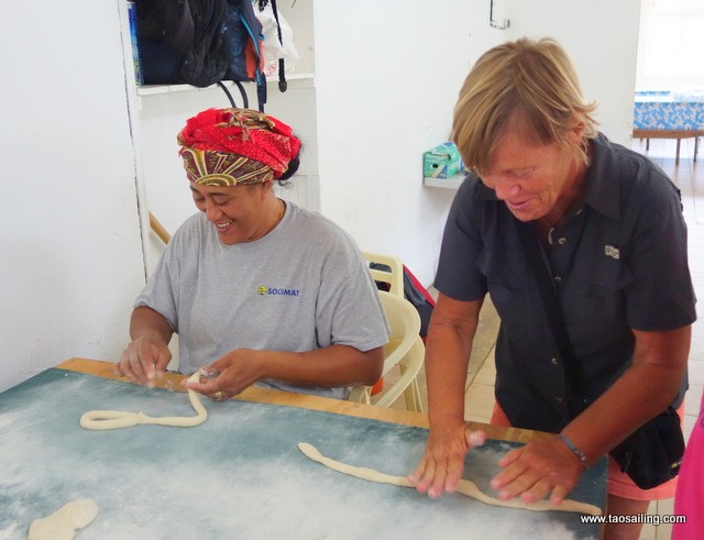 Après cette matinée au plein air Nathalie aide à la préparation du repas communautaire. Une bonne partie de plaisir pour lui apprendre à rouler les firi-firi (beignets) en forme de “huit”.![]()