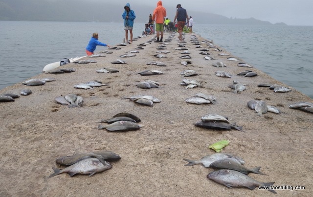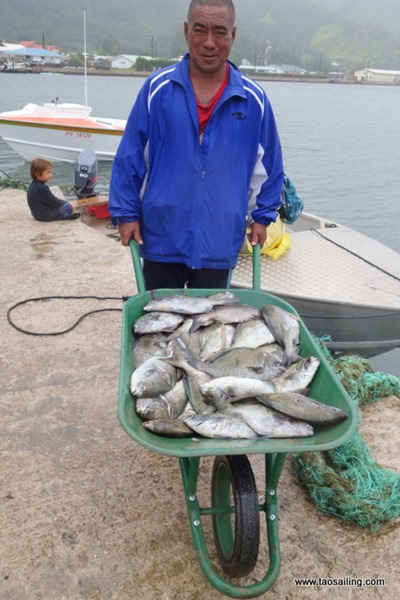Un seul type de poisson est pêché, le Nanoué, car il n’est pas infecté par la ciguatera. La pêche a été “moyenne” et seulement un millier de poissons ont étés ramenés. De retour au quai c’est l’heure du partage et chaque famille de l’île recevra sa part.![]()