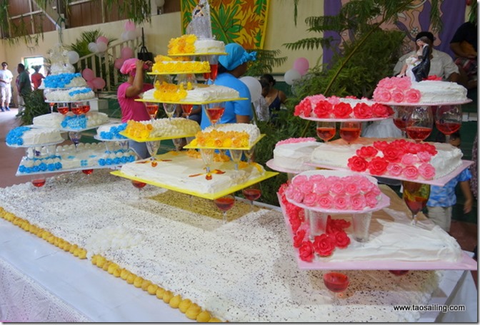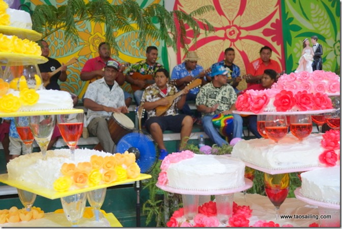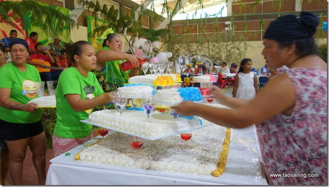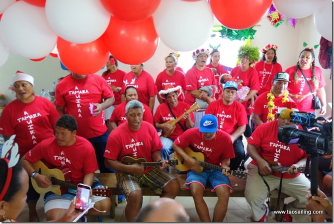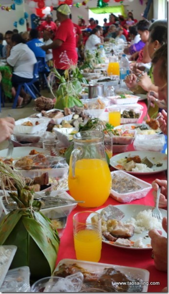 De grandes tables ont été installées les nombreux plats aux saveurs variées nous ouvre l’appétit… popoi (racine du tarot cuite et battue) , fafaru (poisson fermenté dans l’eau de mer) , taïoro (lait de coco fermenté), poisson cru lait de coco, poulet fafa (feuilles de tarot) sont au menu. Il y a tellement de nourriture que nous repartons avec quelques barquettes sur le bateau au cas où nous aurions encore un petit creux!