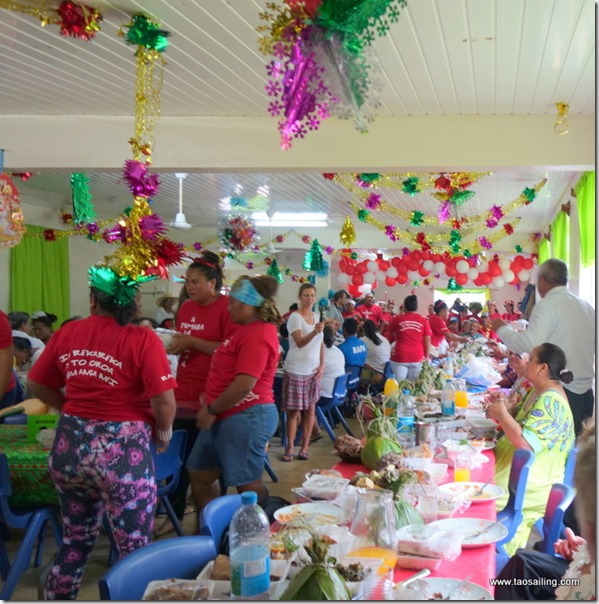 Que de préparatifs pour les habitants de Haurei qui ont décoré la salle communale et organisé le déjeuner du 25 décembre pour plus de 500 personnes. C’est au rythme des “Ukulélés” que la fête commence. Nous avons une table réservée avec les autres voiliers. Une attention bien chaleureuse de la part du Tavana (Maire de Rapa) qui nous souhaite la bienvenue parmi leur communauté et nous remercie d’être venus de si loin en bateau.