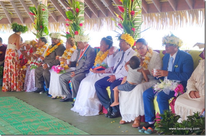 Le grand jour arrive…la célébration des 4 mariages. Les mariés et leur famille sont sur leur “trente et un”, ainsi que les invités dont nous faisons parti. Les robes aux couleurs chatoyantes et les chapeaux sont portés avec grâce par les femmes, tandis que les hommes en costume gris sont couronnées de fleurs de tiare.