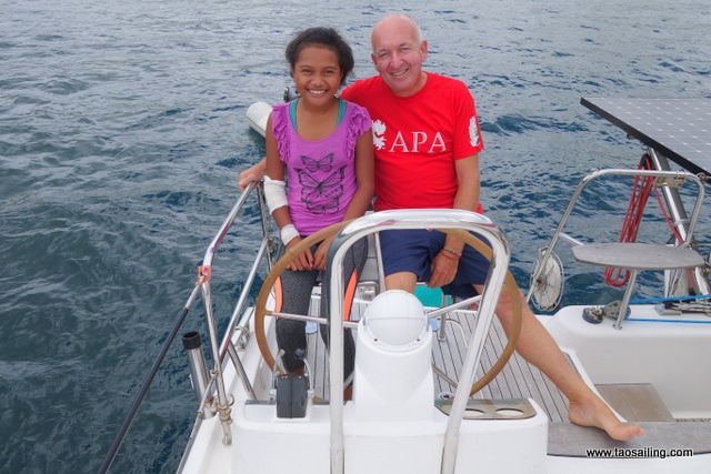 Les enfants pensionnaires à Tubuai Tahiti ou Ravavae qui sont venus avec le bateau passer les vacances en famille veulent tous visiter le bateau…comme il est difficile de satisfaire tout le monde, Philippe fait tout de même quelques allers et retours en annexe avec 3 ou 4 jeunes à bord qui à chaque fois ont droit à la photo en compagnie du capitaine!