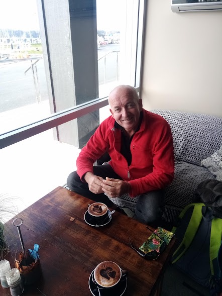 Une fois les formalités d’entrée et l’inspection du bateau terminées, nous allons nous réchauffer avec un capuccino. La température de l’eau est à 15° grr… on espère qu’en été ( décembre) elle sera plus chaude!