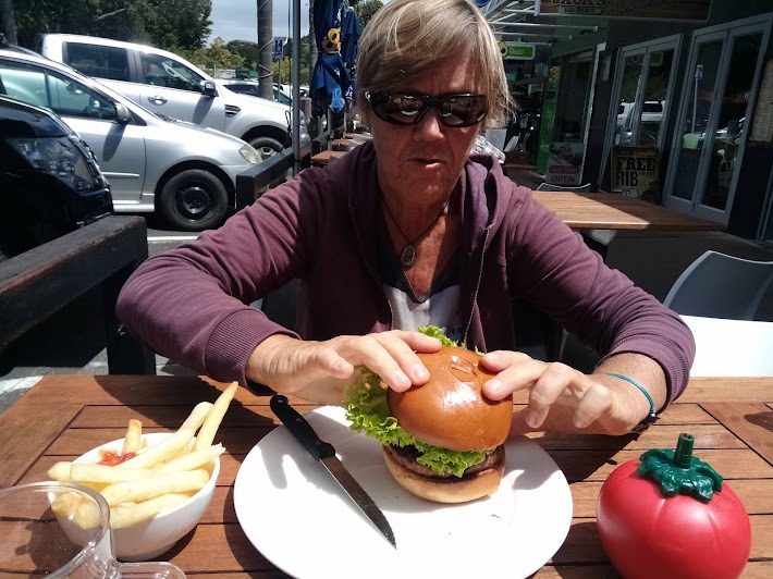 Rien de tel qu’un énorme hamburger pour retrouver notre énergie sauf qu’il nous restera sur l’estomac tout l’après midi. ![]()