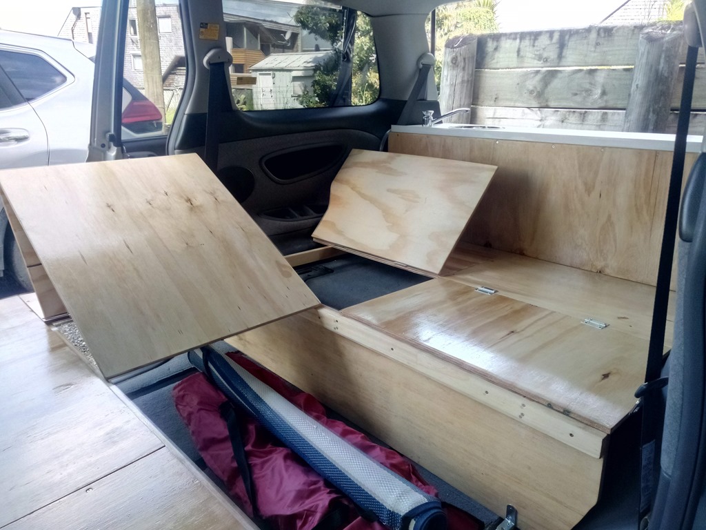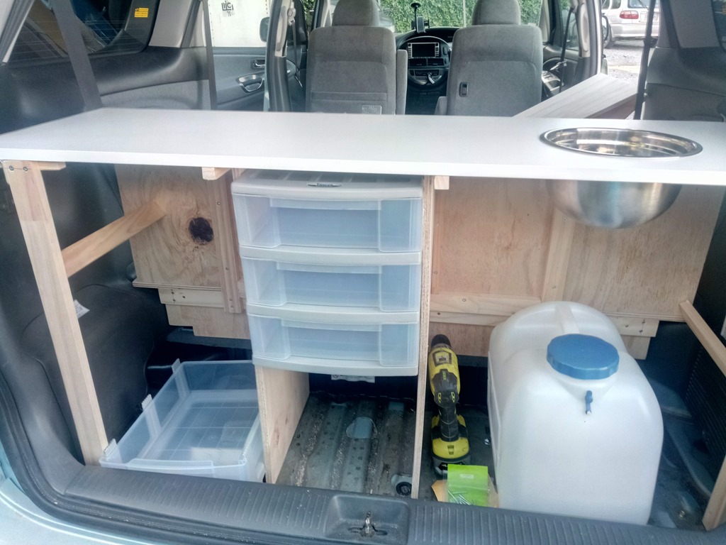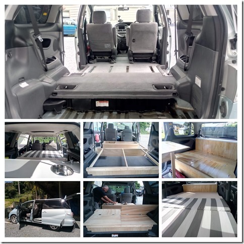 Finalement notre choix se porte sur une Toyota Estima hybride d’occasion en parfait état qui arrive tout juste du Japon. Il ne reste plus qu’à la transformer en van “self contained”( normes Néo-Zélandaise de stockage et d’évacuation des déchets).