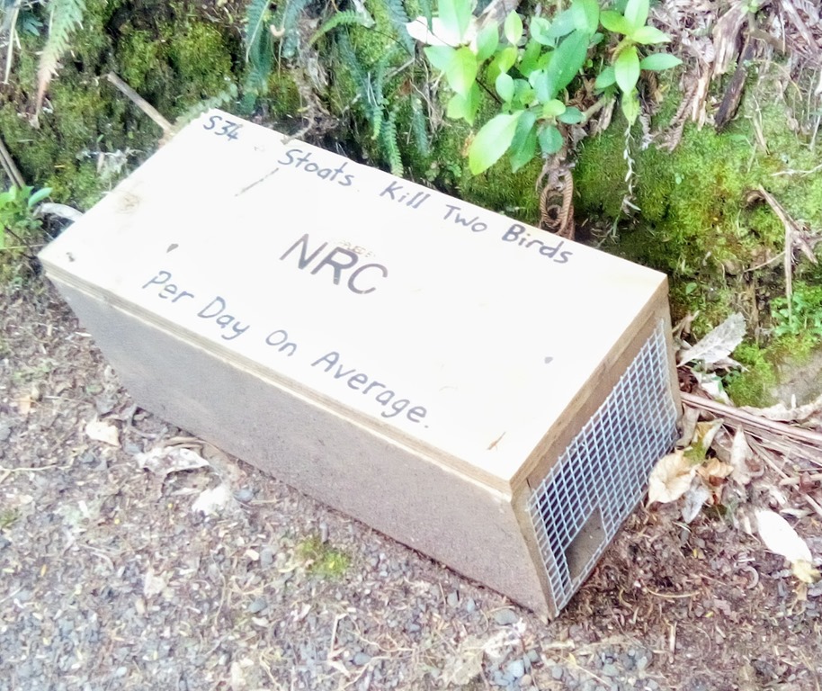 Un peu à l’écart du chemin des caisses en bois sont disséminées dans la forêt. Ce sont des pièges pour les possums et hermines (Stoats) qui perturbent l’éco-systeme Néo Zélandais. Ces vastes programmes d’éradication qui ont été mis en place depuis quelques années semblent être assez efficaces.![]()