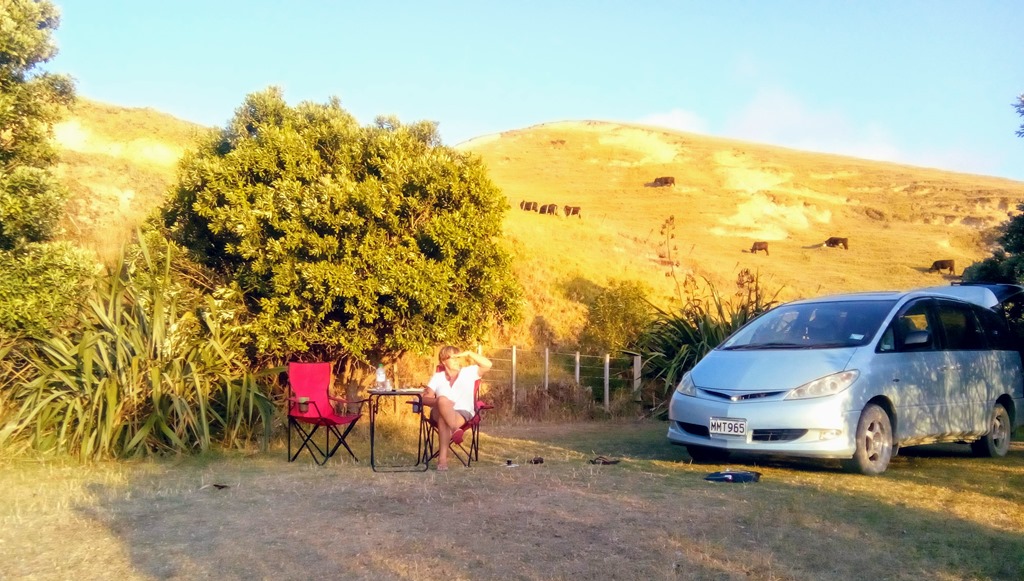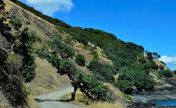 Nous continuons notre route vers le camping de Port Jackson à la pointe nord de Coromandel. La première partie de la route est asphaltée puis elle se transforme sur une vingtaine de kilomètres en une piste étroite et sinueuse recouverte de gravillons. A mi route la piste est ombragée et de vastes collines apparaissent parsemées de moutons ou de vaches. ![]()