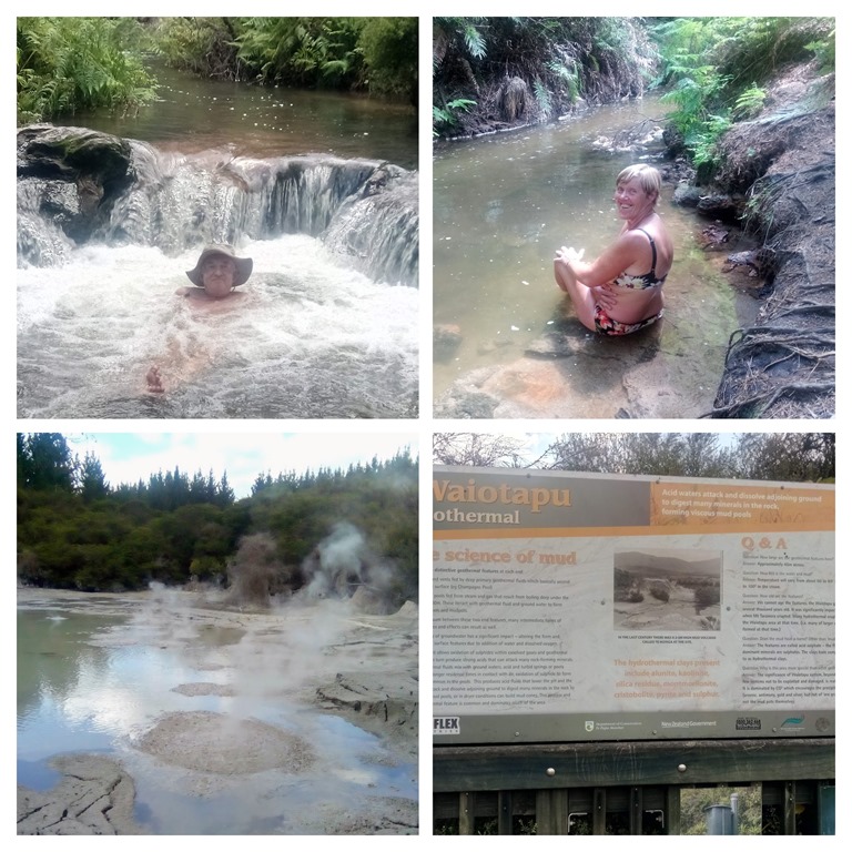 Nous passons par Waiotapu qui est une zone géothermique active située dans la région volcanique du lac Taupo. Après avoir fait le circuit “touristique” autour des nappes de boue fumantes nous allons nous “tremper”dans l’un des nombreux bassins bouillants. La température avoisinant les 40 degrès nous n’y restons pas trop longtemps!![]()