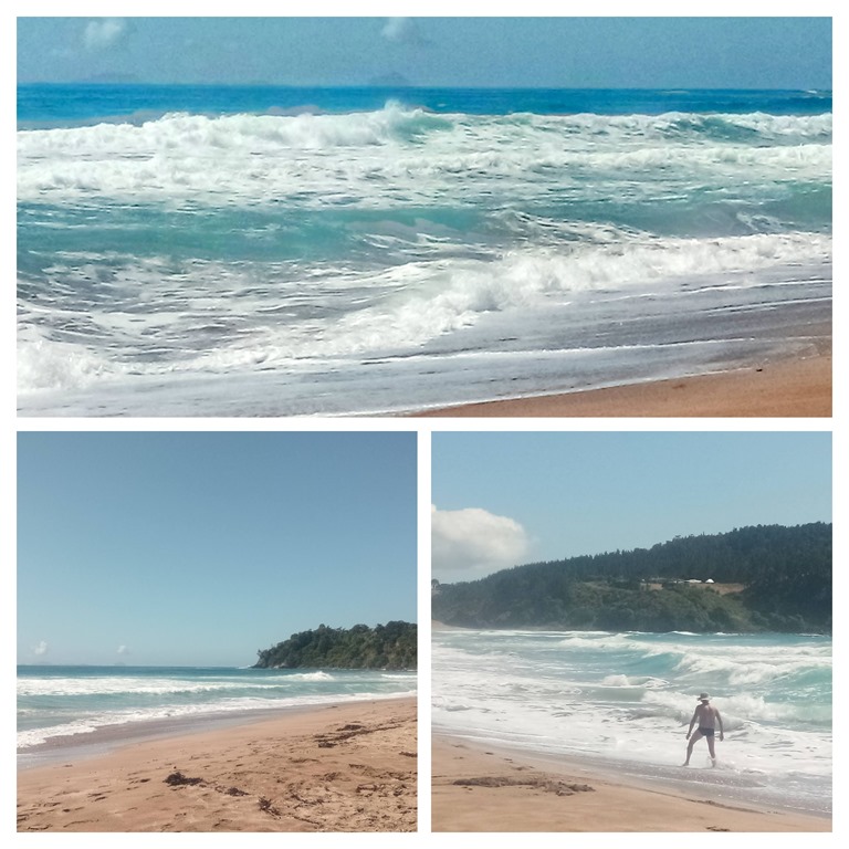 Nous remontons la péninsule en longeant la cote Est jusqu’à la plage “hot water”située aussi dans la zone géothermique. Deux heures avant et après la marée de l’eau chaude remonte naturellement à la surface et chacun peut creuser son propre bassin pour s’y baigner. Nous n’assistons pas à ce phénomène car la marée est haute alors nous nous contentons de l’océan et d’un pique nique à l’ombre.![]()