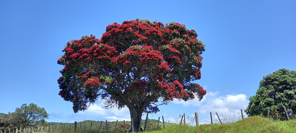 Le Pohutukawa plus communément appelé “Christmas tree” produit en été des masses de fleurs rouges en forme de pointes. ![]()