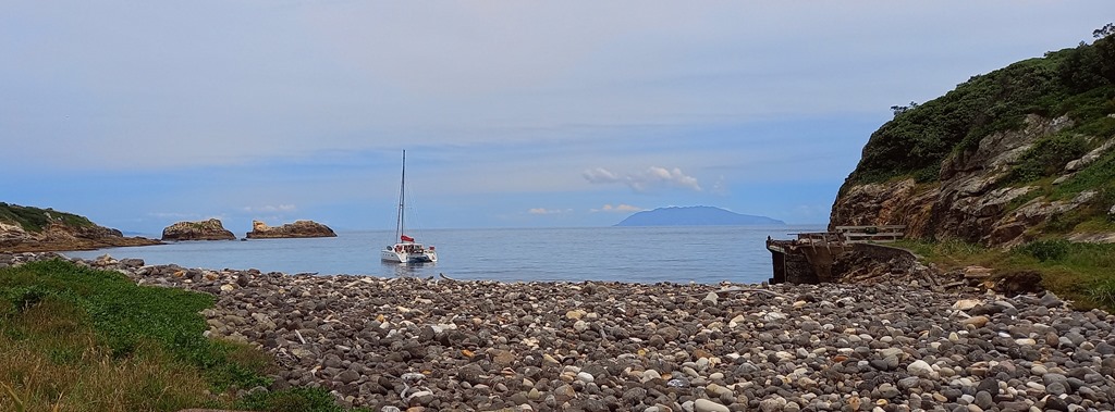 Mokohinau Island où nous marchons jusqu’au phare. L’accès à la plage n’est pas facile avec ces monticules de galets qu’il faut escalader. ![]()