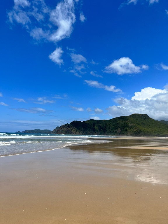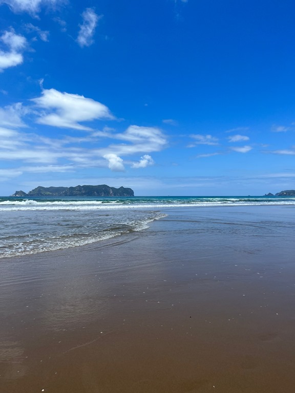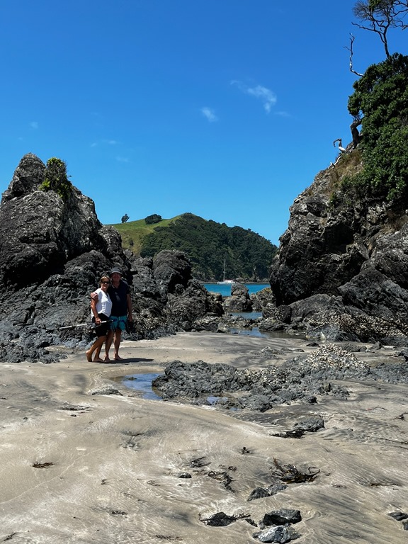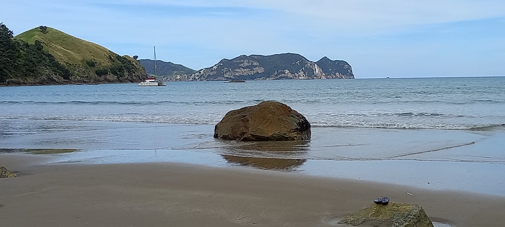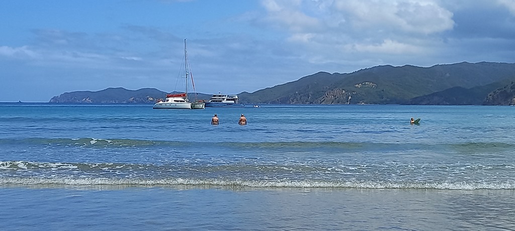 Nous trouvons un bon abri à l’est de Great Barrier, la baie de Whangapoua. L’eau est un peu fraîche (comme toujours en Nouvelle Zélande