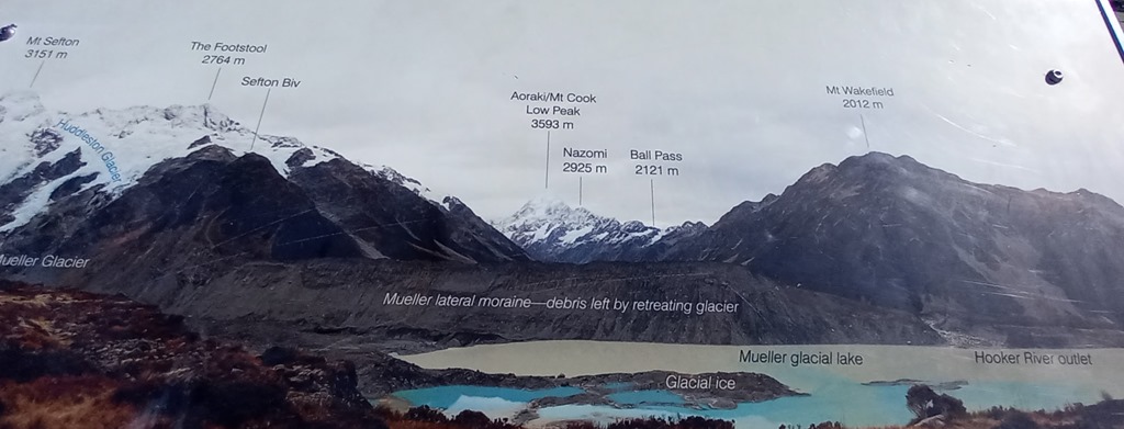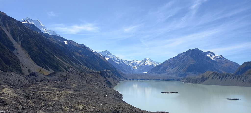 Le glacier Mueller laisse place à un immense mur de débris rocheux causé par le recul du glacier (moraines). On retrouve la couleur grise laiteuse du lac qui donne un paysage lumineux avec la perspective du Mont Cook partiellement enneigé. ![]()