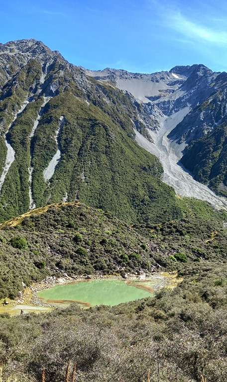 Début du sentier de “Hooker Valley” en passant par le “Blue Lake”qui est devenu verdâtre au fil du temps. La raison étant que le glacier Tasman n’est plus alimenté par la fonte des glaces mais par la pluie. De ce fait l’eau qui stagne favorise la prolifération d’algues qui donnent cette couleur verte. ![]()