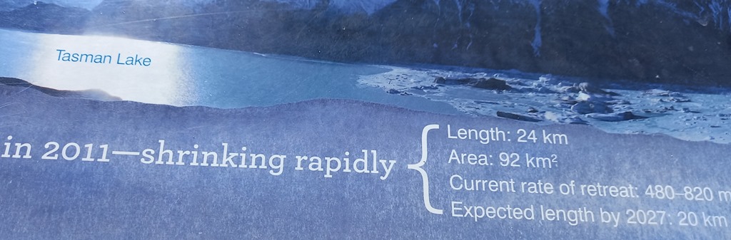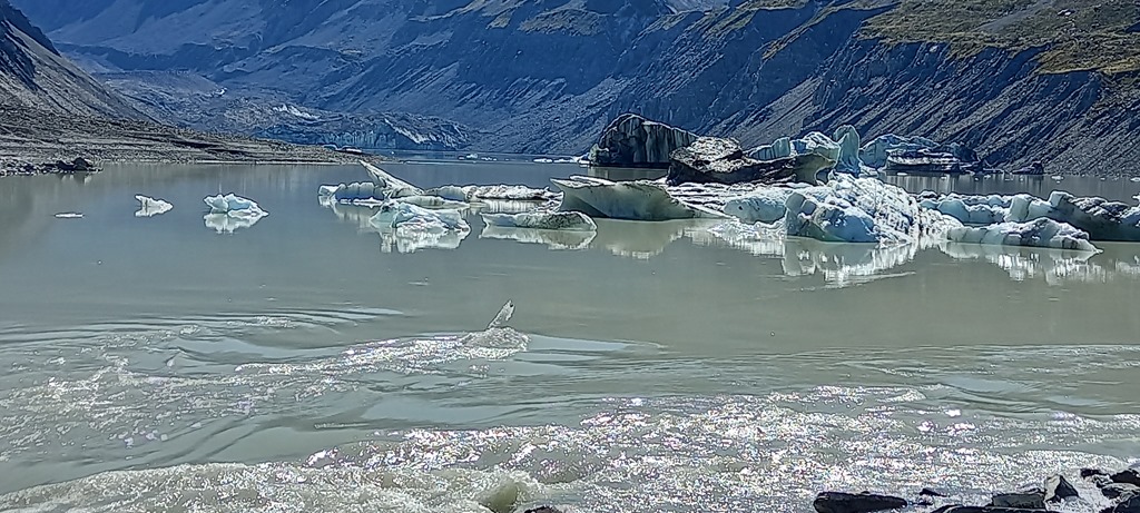 Le glacier Tasman comme le lac Mueller ou le lac Hooker sont de couleur grisâtre. Ce phénomène est dû à la “farine de roche” ( fines particules de roches en suspension dans l’eau) présente en si grande quantité qu’elle donne une teinte laiteuse et grise aux lacs.