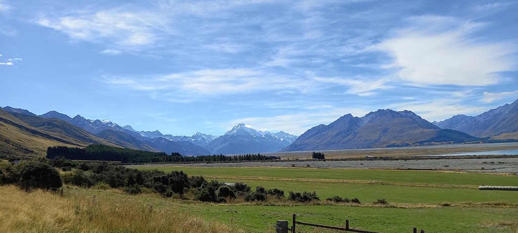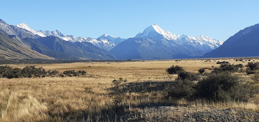 Nous sommes en plein cœur de la région du Canterbury dans les plaines du Mackenzie au pied des sommets enneigés du Mont Cook et du lac Pukaki. Le Parc National du Mont Cook est le point de départ des randonnées à environ 60 kms de Twizel où nous avons notre Airbnb.