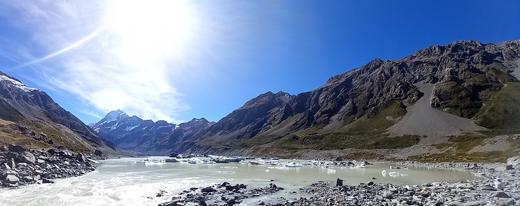 Point de vue sur le lac et le glacier Hooker et le Mont Cook en arrière plan. Avec le réchauffement climatique le glacier recule d’au moins 1km chaque année et fait place à un lac parsemé d’icebergs qui s’entrechoquent et fondent quand le soleil est intense. ![]()