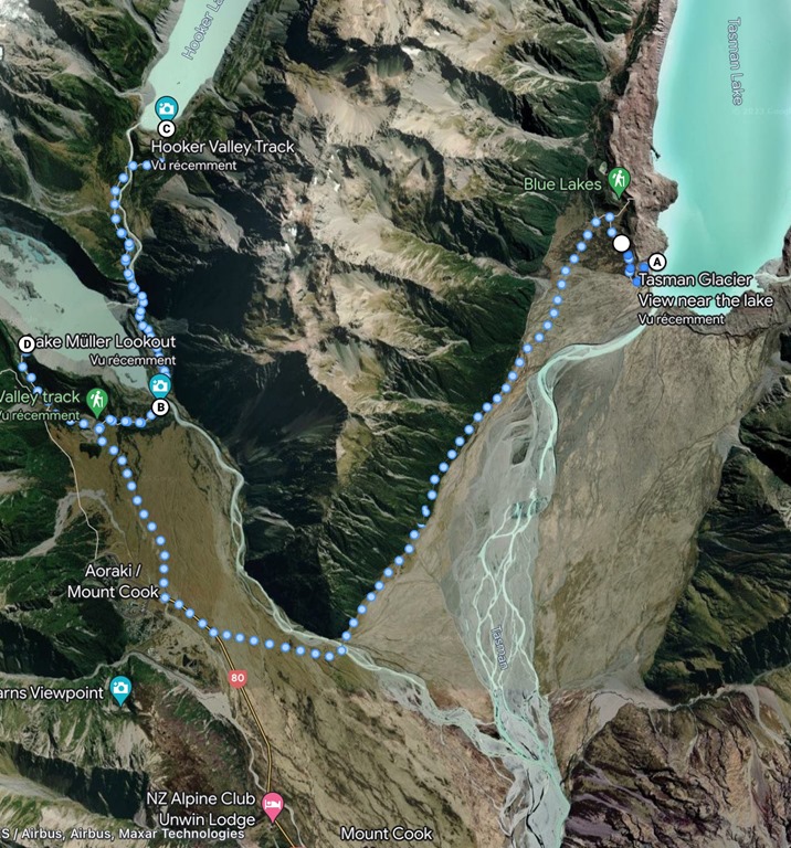Autre marche de 11 kms aller retour qui longe le côté est du lac Mueller jusqu’au lac Hooker avec les trois ponts suspendus que l’on traverse. ![]()