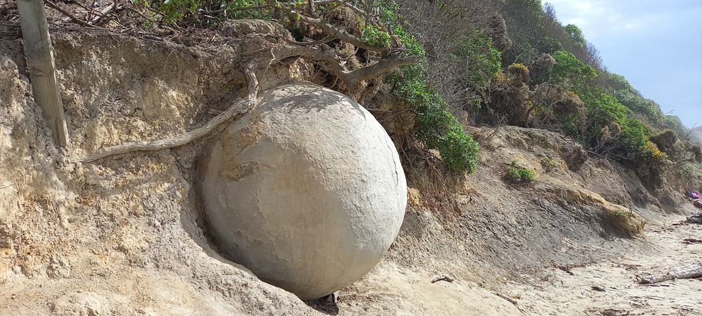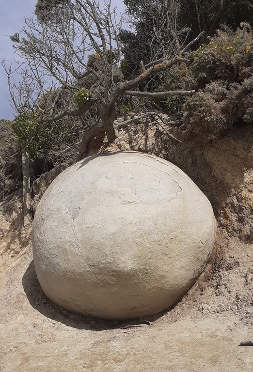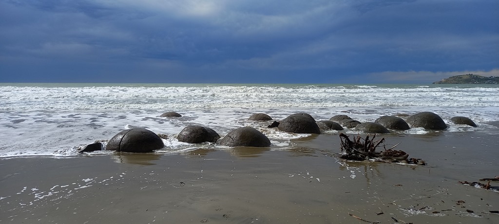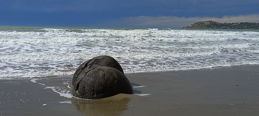 Nous ne pouvions pas longer le littoral sans nous arrêter aux Moeraki Boulders. Les roches lisses et parfaitement rondes sont visibles à marée basse et s’étendent sur des kilomètres. Quelles en sont les origines? Selon la culture des Maoris il y a des millions d’années un canoé se serait échoué et les débris se seraient transformés en pierre. Une légende intrigante! L’autre version est de dire que ces roches se seraient formées au fond de la mer par accumulation de dépôts calcaires autour d’un noyau! ![]()