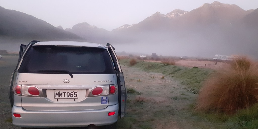 les vitres extérieures et intérieures de la voiture sont verglacées il fait – 3 degrés. Il nous faudra un bon quart d’heure pour tout dégivrer, nous réchauffer et prendre la route vers Milford Sound! ![]()