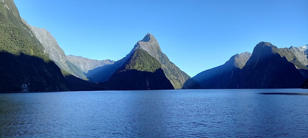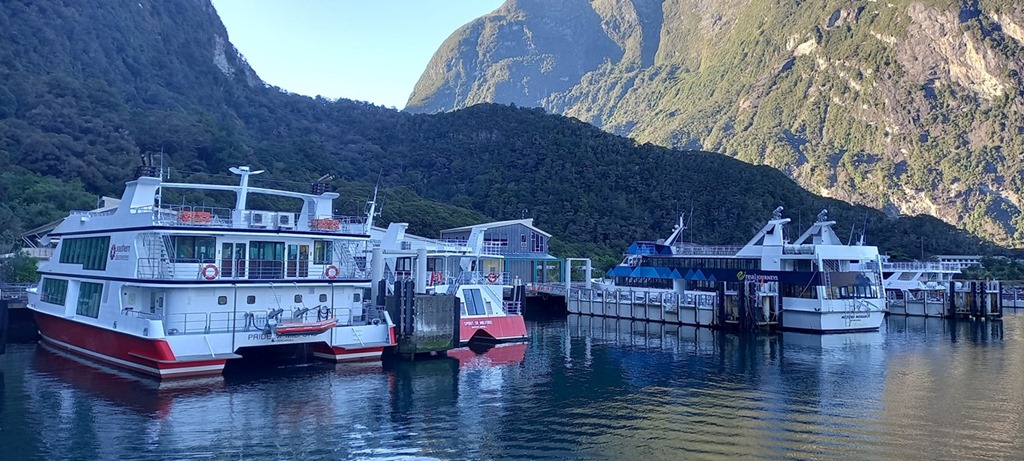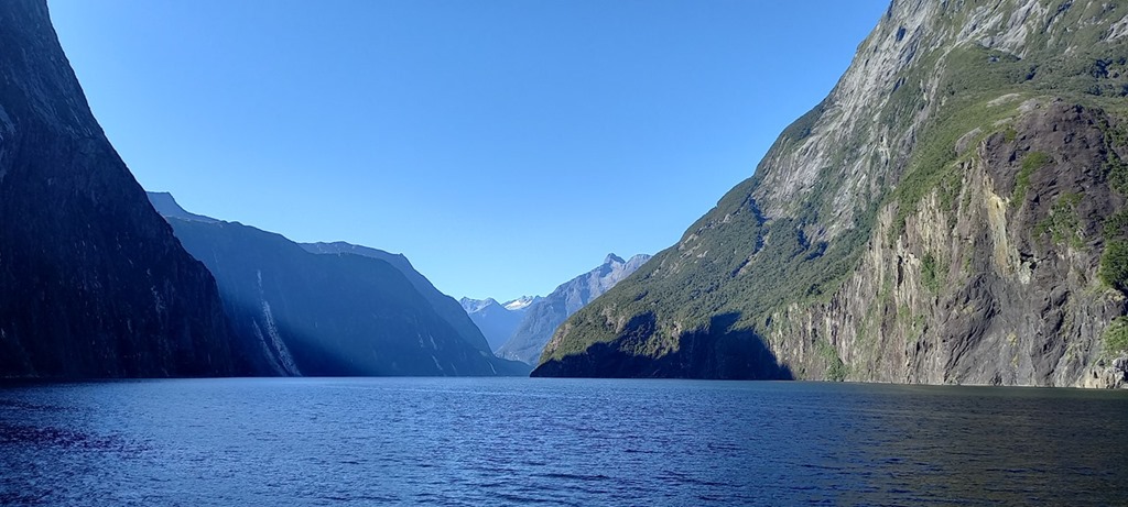 . Nous parcourons en 3h30 les méandres du fjord jusqu’à l’embouchure de la mer de Tasman. La lumière est magnifique et malgré le froid nous restons sur le pont. Nous faisons un arrêt à l’observatoire sous marin flottant. C’est une salle avec des baies vitrées à 10 m sous la surface du fjord où l’on peut observer les poissons et le corail. Dommage que l’eau soit si trouble pour des photos. ![]()