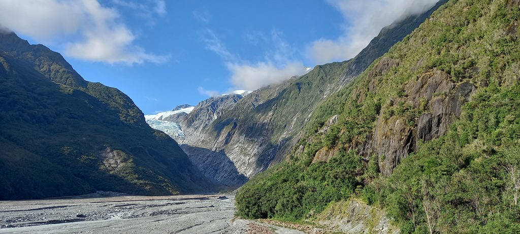 Situé dans le “Westland Tai Poutini National Park” le glacier a tellement reculé depuis plusieurs années qu’il ne peut être observé qu’à distance. Le sentier traverse une forêt tropicale très dense et variée. Les fougères, les mousses et les arbres bordent le chemin mais aussi de magnifiques champignons bleus