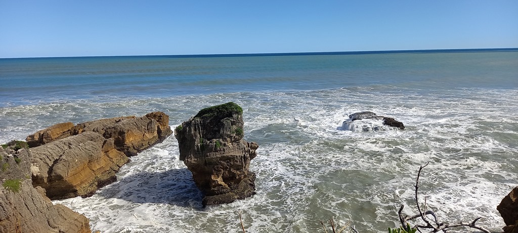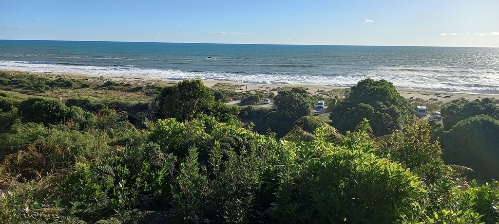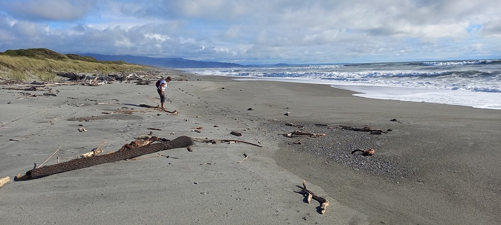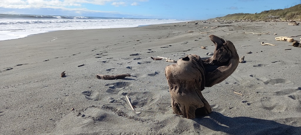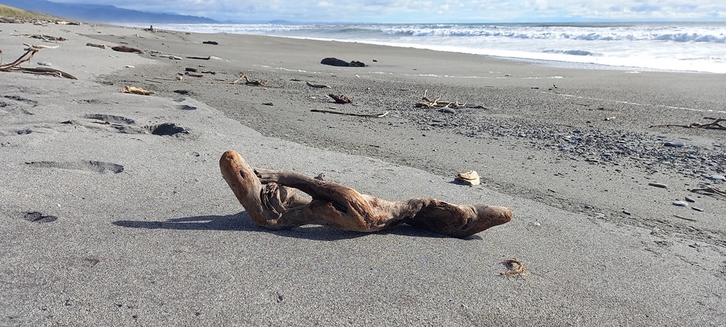 nous manque un peu nous allons jusqu’à la petite ville de Ruatapu déjeuner et nous promener le long de la plage. La région connue pour son jade est touristique. De nombreux magasins proposent toutes sortes d’objets en jade à des prix exorbitants. La plage est immense elle est jonchée de troncs en bois flotté aux formes parfois biscornues. Nous scrutons chaque petite pierre au cas où nous tomberions sur des petits morceaux de jade…![]()