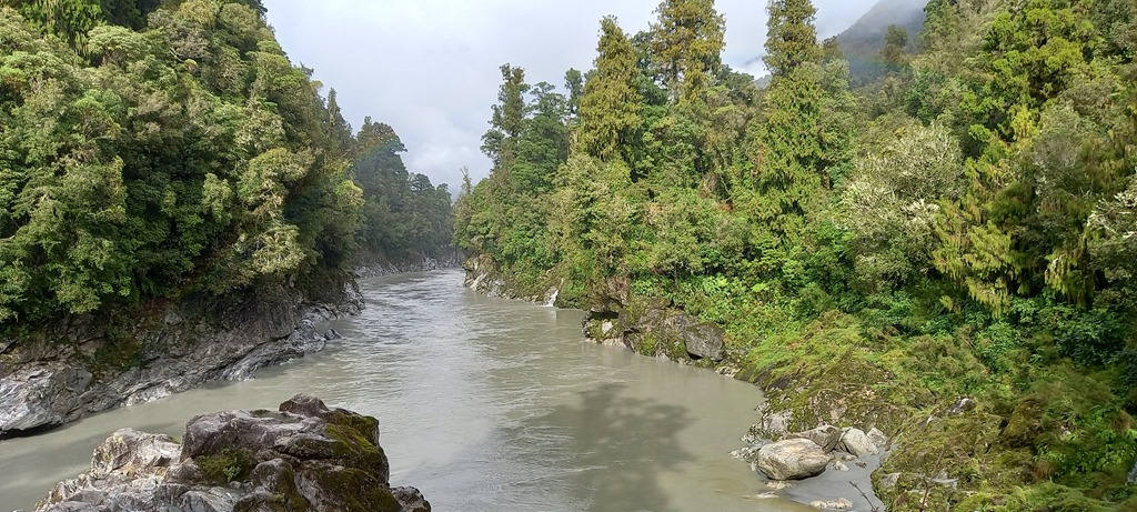 L’autre attraction du coin se sont les gorges situées dans les terres, à une trentaine de kilomètres de la ville d’Hokitika. Connues pour être d’un bleu irréel nous n’avons pas eu de chance car la rivière est brunâtre suite aux récentes pluies. ![]()