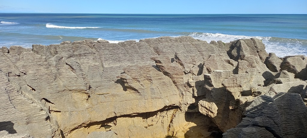 L’activité sismique étant importante dans cette région, les formations ont fini par sortir de l’eau, puis l’action du vent et de l’eau ont fini par les éroder, laissant apparaître cet aspect de “crêpes ” fines et horizontales. ![]()