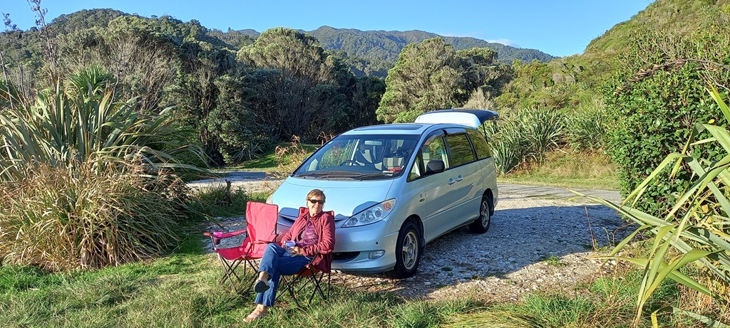 Le Camping de Kohaihai marque la fin de la route côté nord-ouest de l’île et nous offre une tranquillité absolue face à la mer parmi les cris des Kiwis à la tombée de la nuit. ![]()