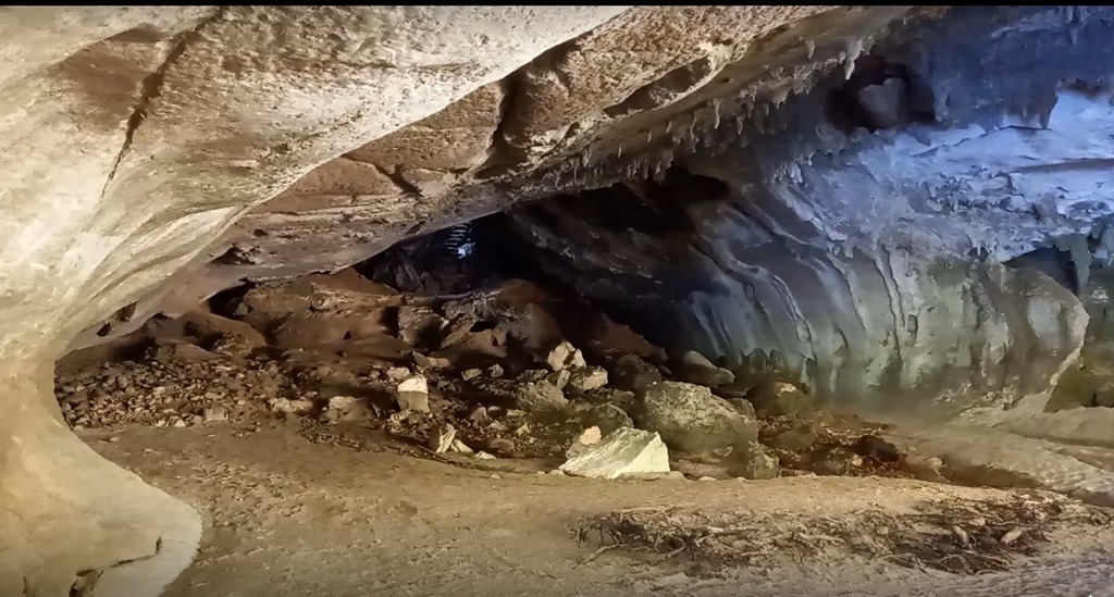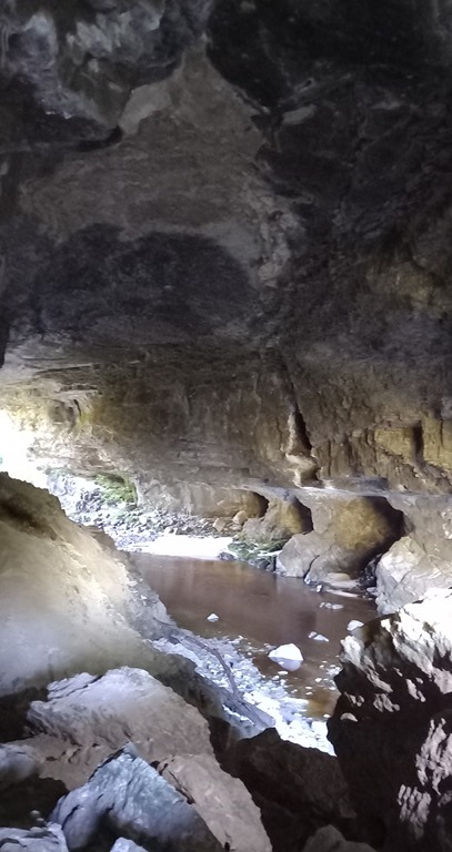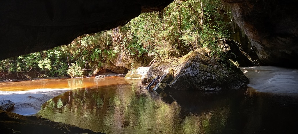 Nous explorons la dernière grotte dont la partie centrale de la voûte est spacieuse elle est tapissée par endroits de racines. Le sol est recouvert de sable accumulé par la rivière Oparara.