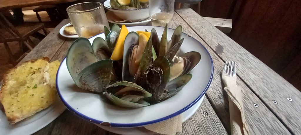 Déjeuner au “Mussell Inn” à Onekaka petite ville plus au nord où la spécialité sont les moules vertes accompagnées d’un pain à l’ail fait maison un vrai délice! ![]()
