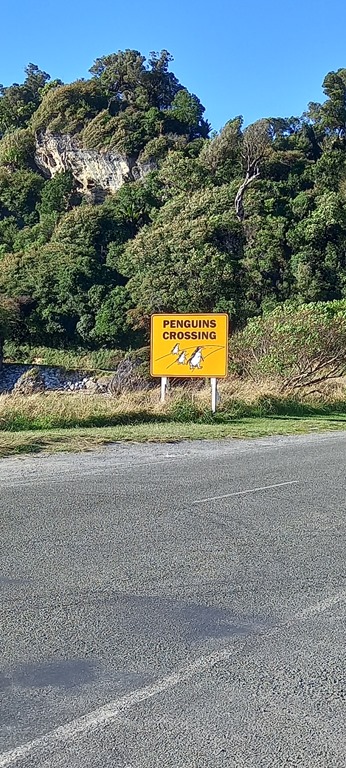 Le lendemain nous reprenons la route côtière où nous espérons croiser une famille de pingouins comme l’indique le panneau! ![]()