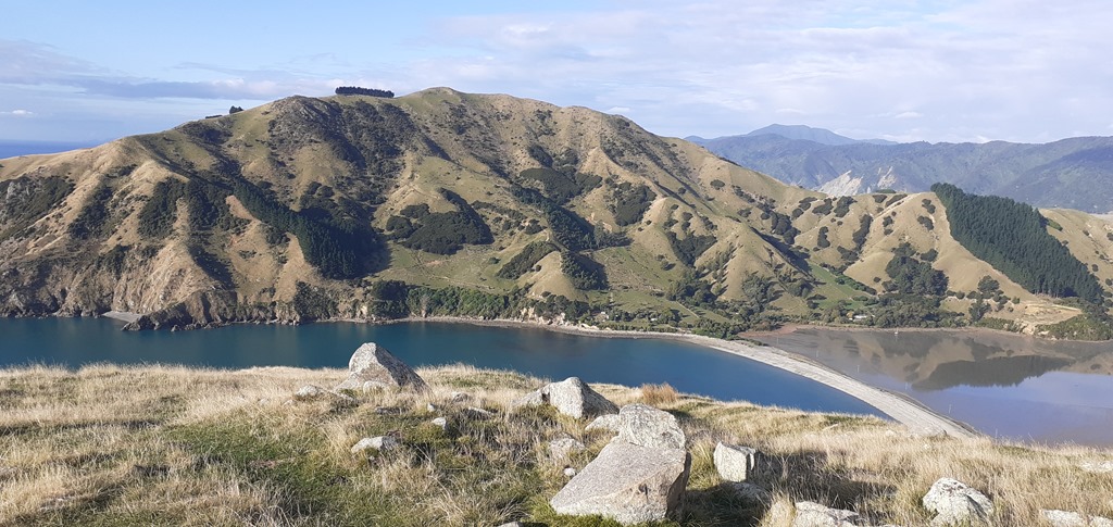 Dernière balade de la journée sous la grisaille à l’extrême pointe nord. C’est à travers champs que nous grimpons jusqu’au point de vue de la langue de sable de Farwell Spit longue de 26 kms où les oiseaux migrateurs se rassemblent en automne.