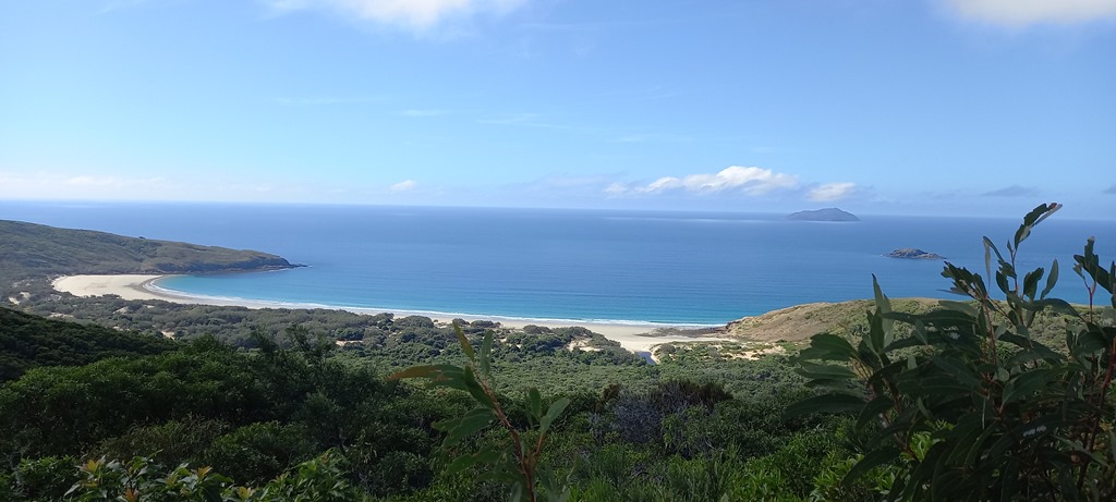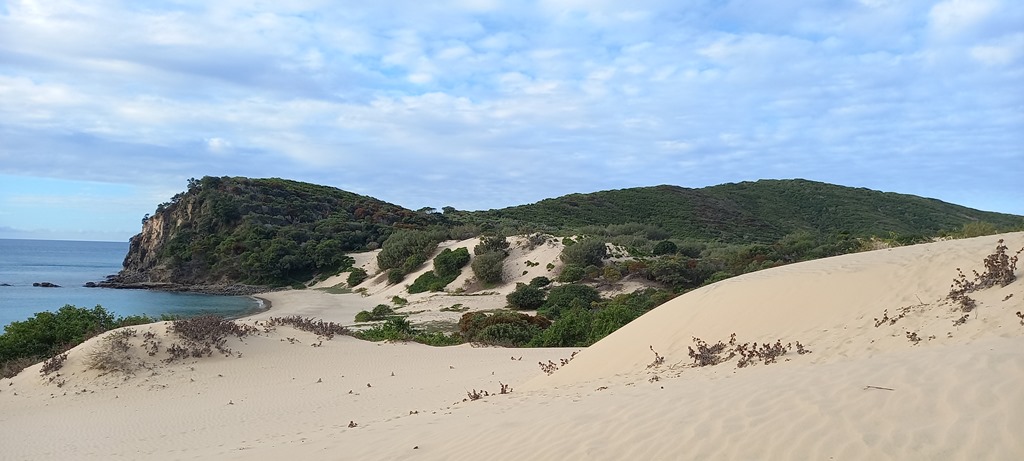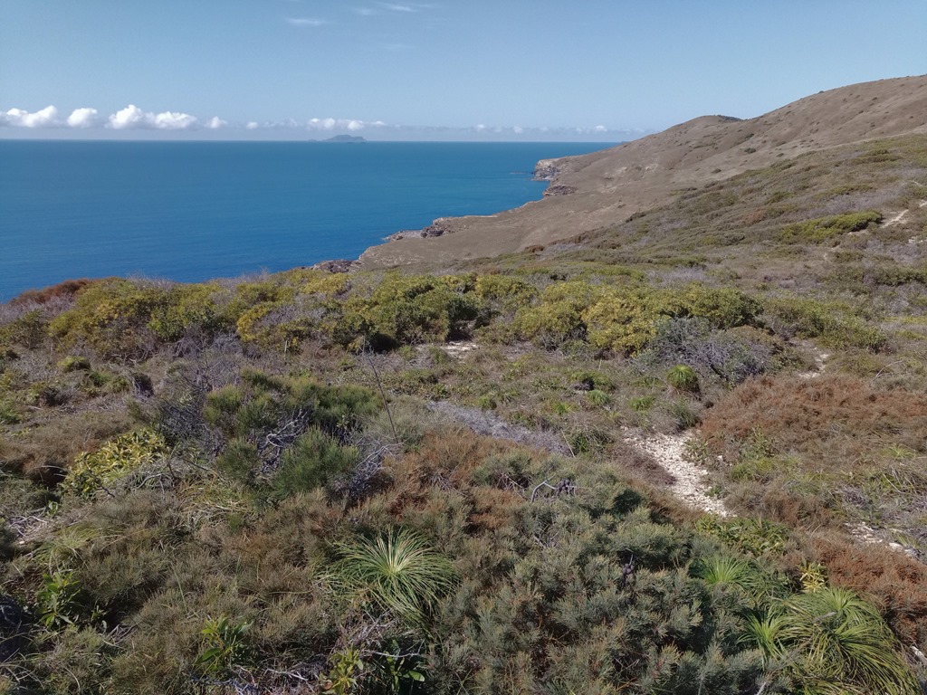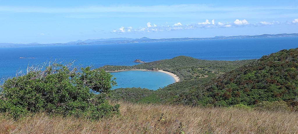 Le chemin démarre de la plage et monte progressivement à travers une végétation roussie par le soleil et brulée par des feux récents. Puis nous arrivons du côté est de l’île avec en perspective de grandes plages de sable blanc et quelques campings. Au retour nous redescendons par la forêt d’arbres les Australian grass qui ont des formes bien différentes de ceux que nous avons vus jusqu’à présent. ![]()