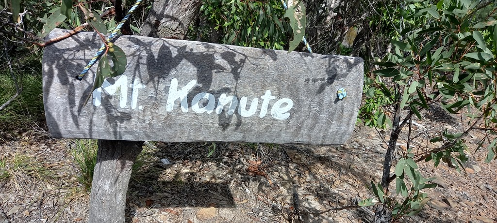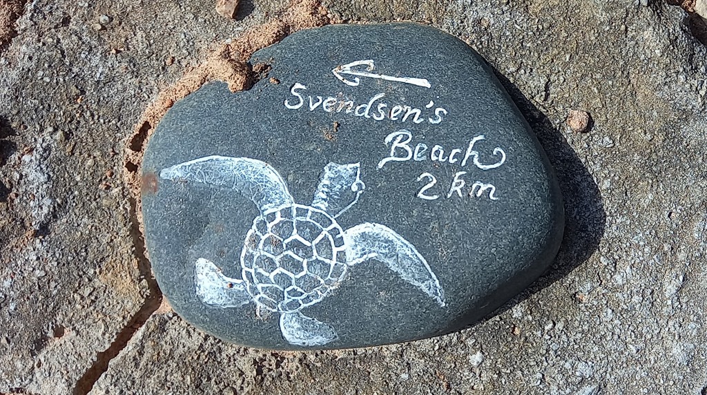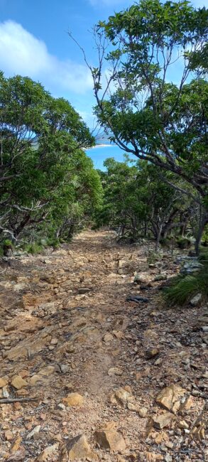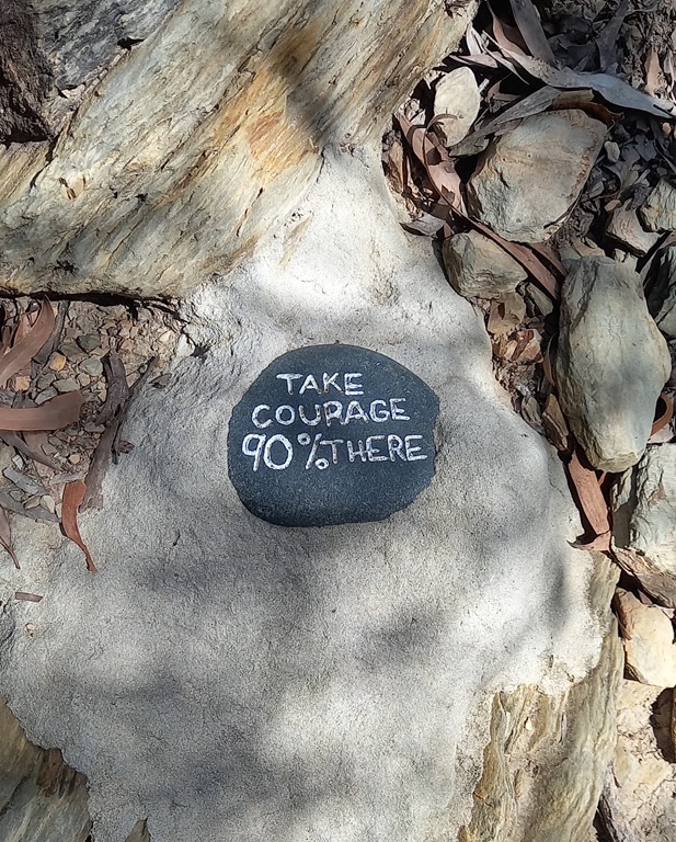Le sentier grimpe graduellement en passant par une forêt d’eucalyptus et d’arbres endémiques “Australian Grass”. Ces arbres poussent le long des côtes sur des sols pauvres et ont la particularité d’avoir des feuilles inflammables et des troncs qui résistent au feu. Nous voilà presque arrivés au sommet d’après le signe d’encouragement peint sur le galet!