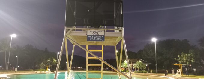 Nous retrouvons Joanne et Mark lors d’un dîner face à la piscine publique aménagée avec trois bassins. Le panneau rappelle aux “baigneurs” une règle essentielle d’hygiène!