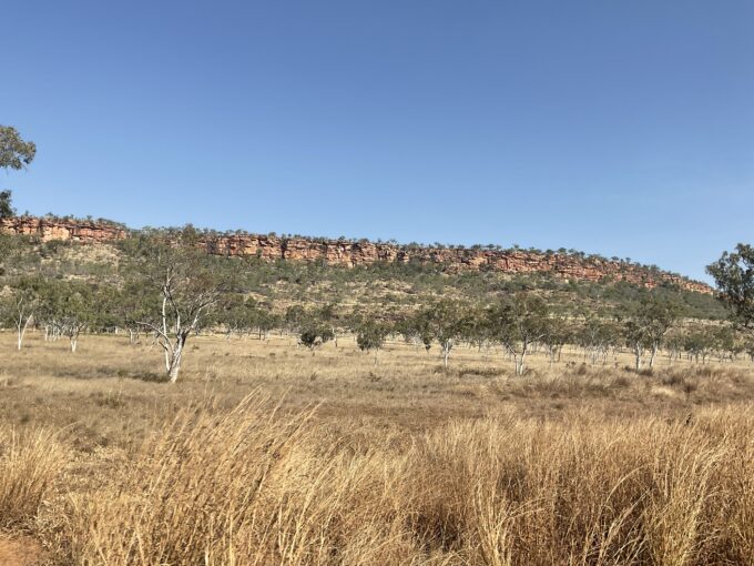 Nous approchons du Mount Barnett, le paysage change avec cette rangée de falaises de grès rougeâtres à perte de vue.