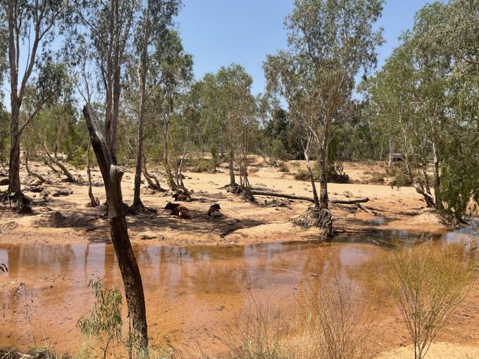 Au bout de trois heures de piste poussiéreuse, une pose déjeuner au bord de la Gibb River s’impose. Il fait si chaud que les vaches sont affalées sous les quelques arbres offrant de l’ombre.