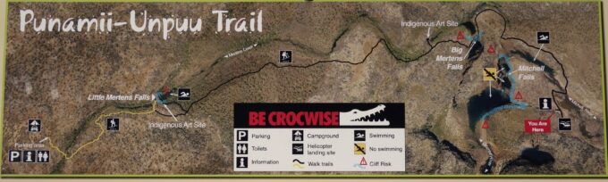 Ce matin pas de piste mais une randonnée de 8,5kms pour Philippe jusqu’aux Mitchell Falls ou Punamii-unpuu. Cette marche est indiquée comme étant difficile avec un peu d’escalade et Nathalie préfère rester au campement.