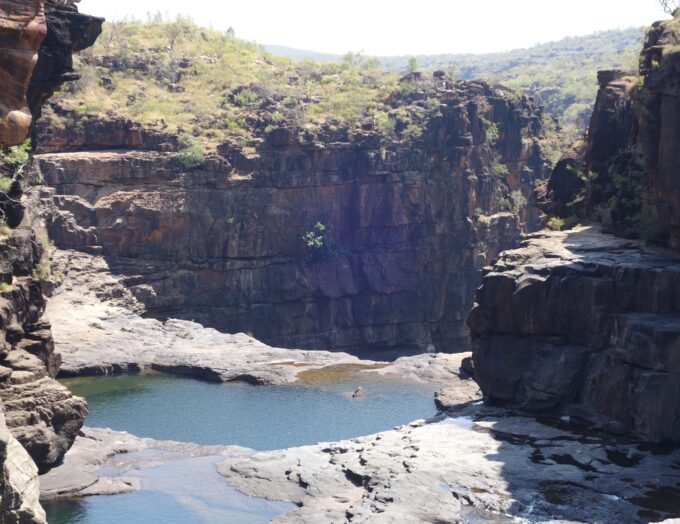 La route a été pénible et nous sommes bien contents d’arriver au terrain de camping de Mitchell Falls. Nous avons encore de l’énergie pour marcher jusqu’à la première cascade Little Mertens falls. Malheureusement elle est complement sèche.
